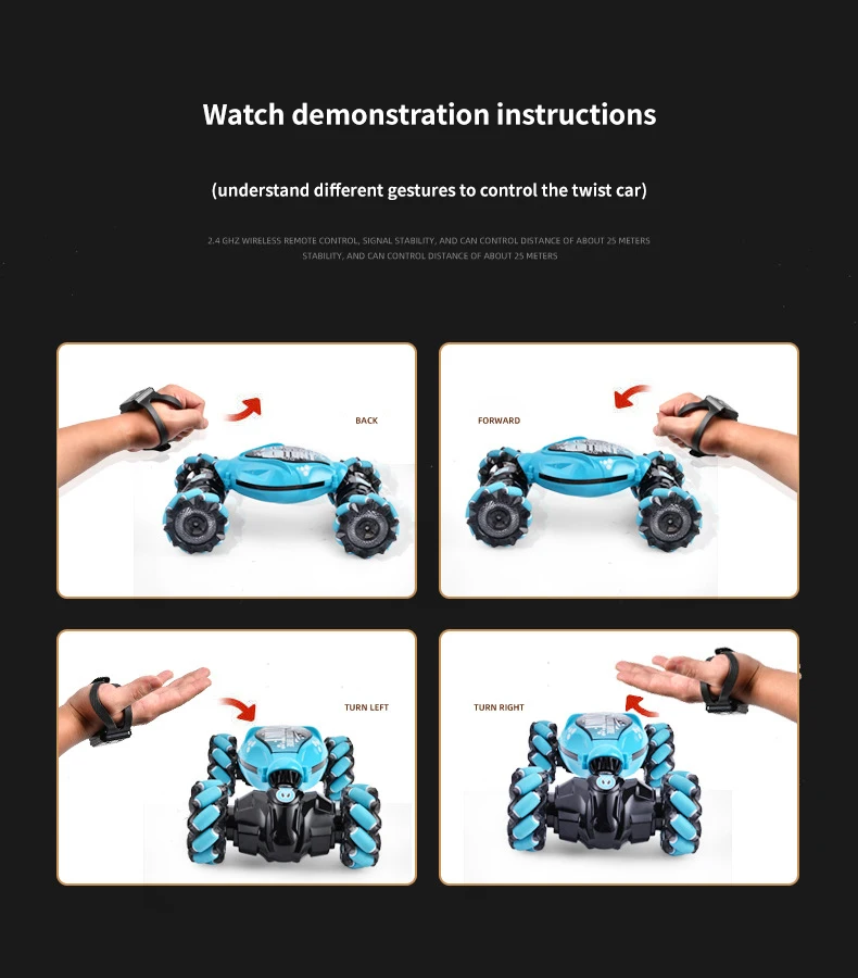 Function | 【Double Ways Control Modes】Our rc stunt car is upgraded with 2 control ways: gravity sensor watch controland remote controller. You just need to wear a gesture-sensing watch and give a gesture, and the remote control car will act accordingly. Or you can easy to control remote controller with 2.4ghz transmitter strength, that is sensitive and responsive, you can be maneuvered even from a far distance.(You can not control the car toy with two way at the same time.) |